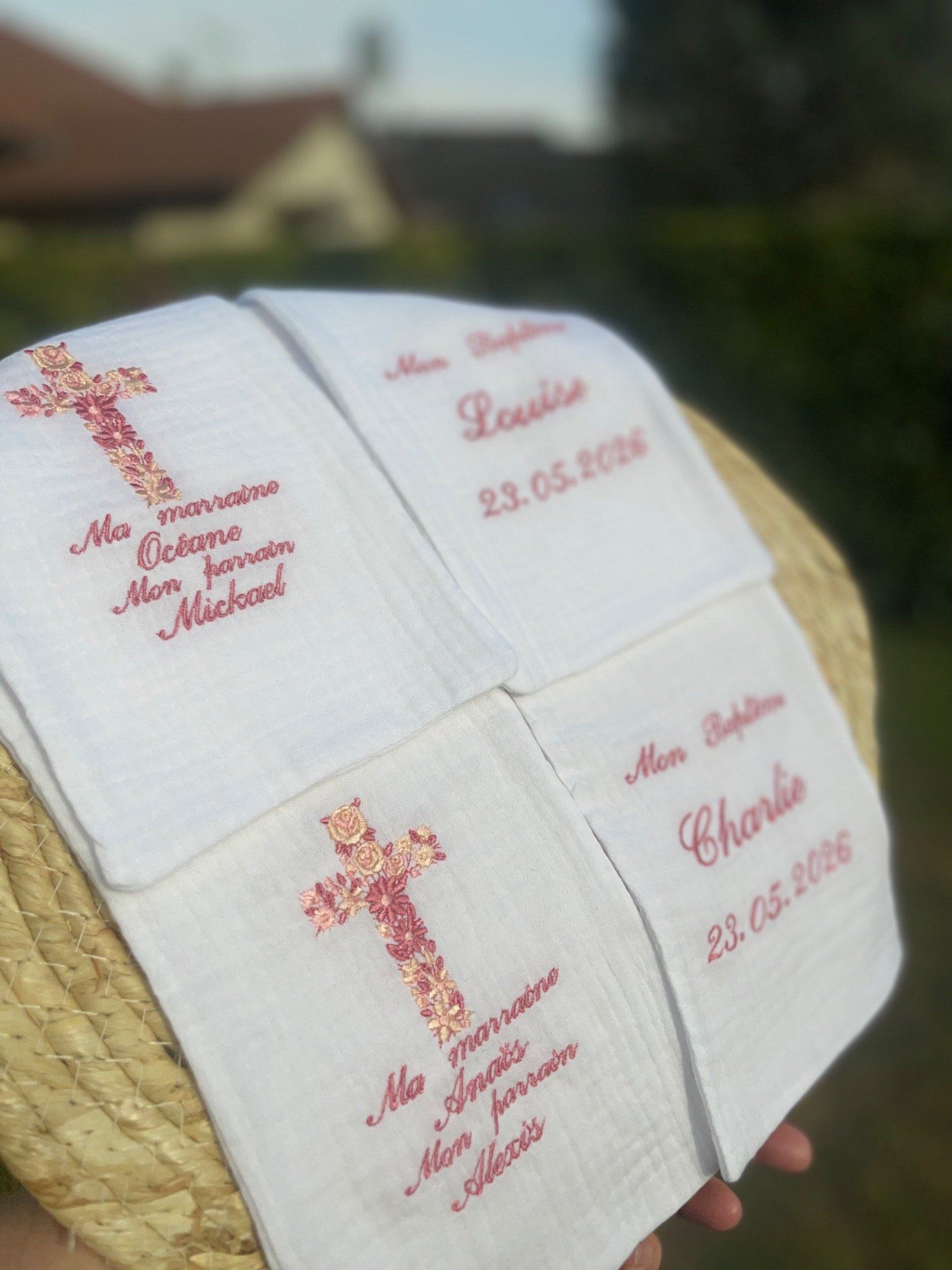 Je vous propose cette écharpe avec personnalisation du prénom et de la date de baptême de votre enfant.
