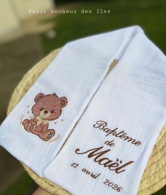 Je vous propose cette écharpe avec personnalisation du prénom et de la date de baptême de votre enfant.
